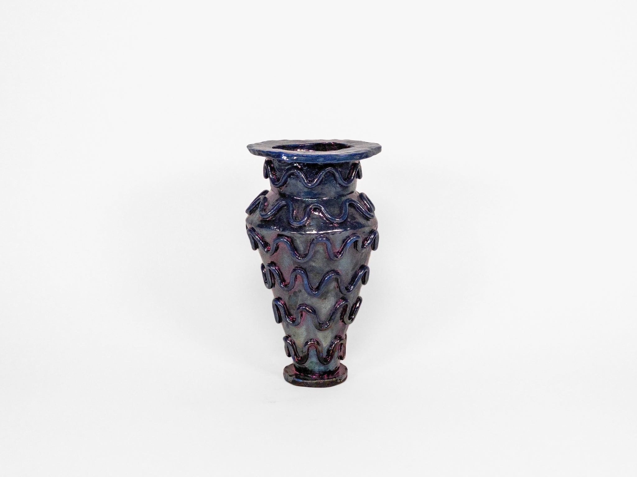 This piece was created using the raku firing process, a technique originated in 16th-century Japan. Raku is a process in which ceramics are removed from the kiln at volcanic temperatures, and allowed to react with various combustible materials (straw, sawdust, hair, ect...). The residual heat of the kiln heat ignites the materials and produces striking surface effects—iridescent glazes, metallic lusters, and intricate crazing patterns—each firing yields unique and unpredictable effects. The interior of this piece has been clear coated to make it water tight.