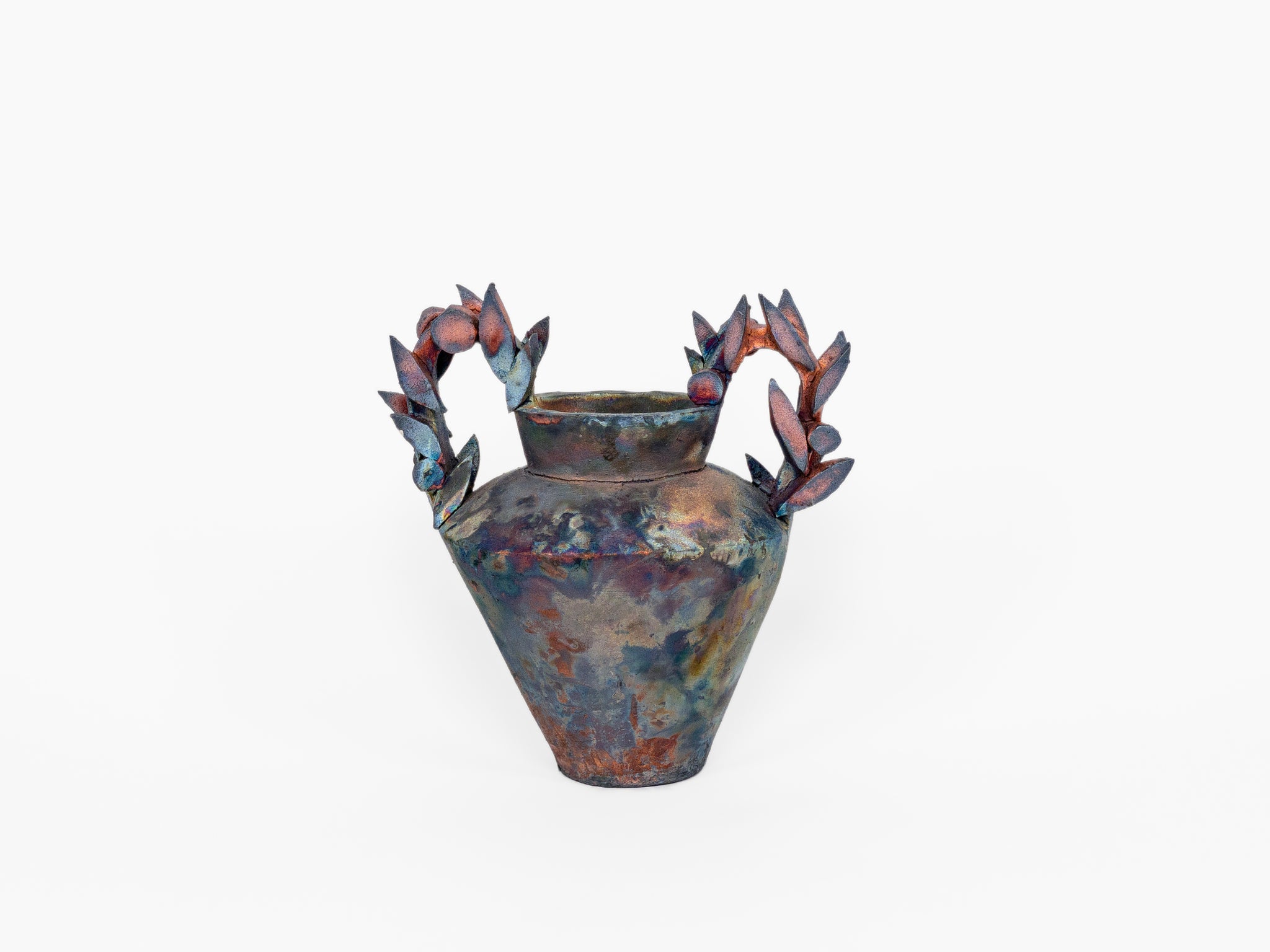 This piece was created using the raku firing process, a technique originated in 16th-century Japan. Raku is a process in which ceramics are removed from the kiln at volcanic temperatures, and allowed to react with various combustible materials (straw, sawdust, hair, ect...). The residual heat of the kiln heat ignites the materials and produces striking surface effects—iridescent glazes, metallic lusters, and intricate crazing patterns—each firing yields unique and unpredictable effects. The interior of this piece has been clear coated to make it water tight.