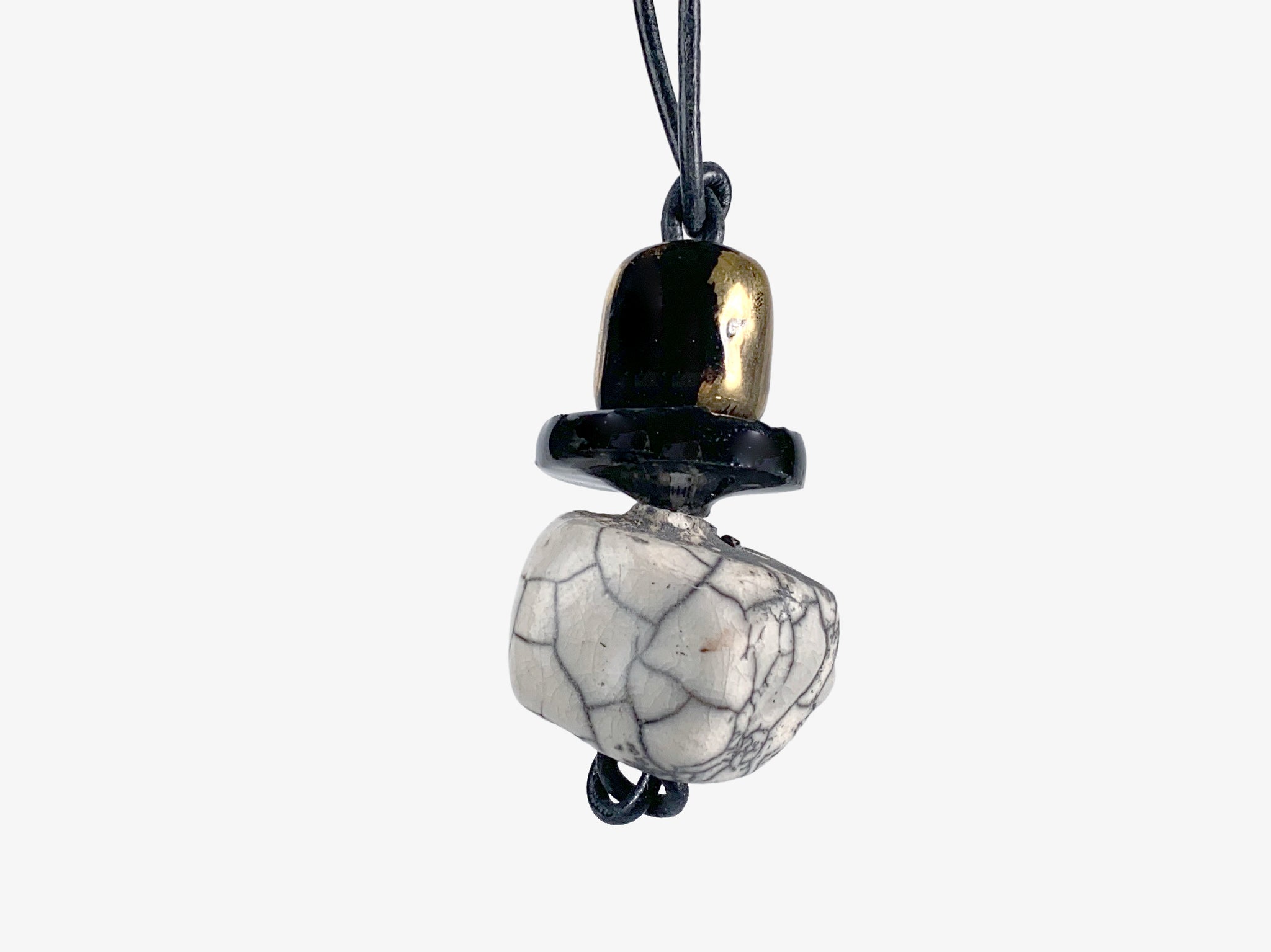 Materials: Raku-fired stoneware, glazed stoneware, gold luster, leather cord
